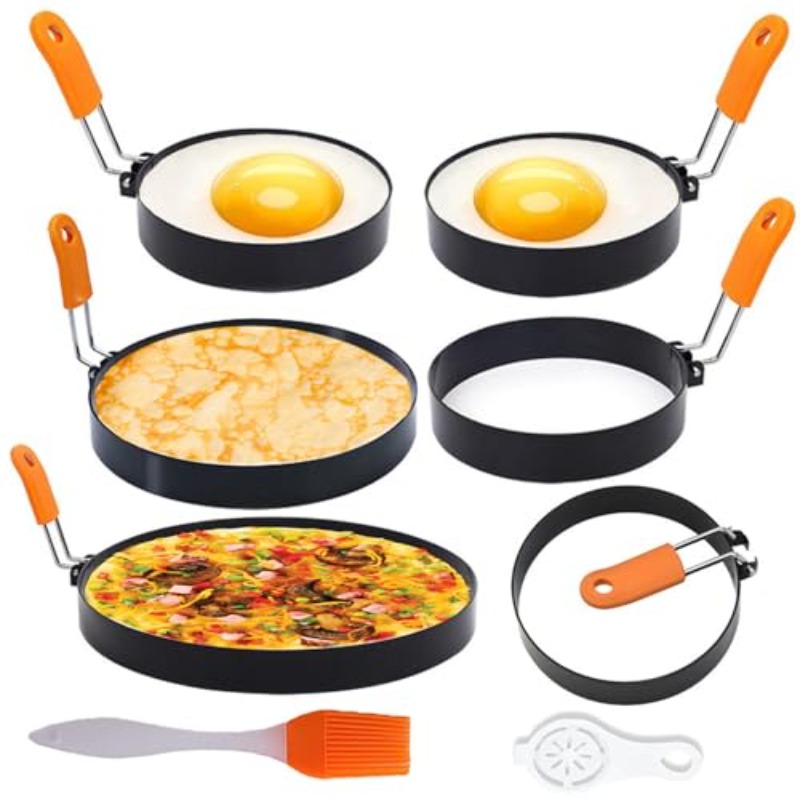 6pcs Professional Egg & Pancake Ring Set with Non-Stick Stainless Steel Cooking Rings (8”/6”/4” Omelette & Pancake Molds) + Bonus Egg Separator & Oil Brush Suitable for Griddle, Frying Eggs, Breakfast, Crepes, English Muffins