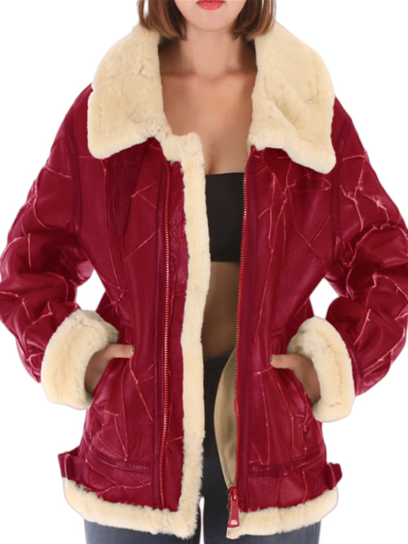 Women's Thickened Sheepskin-Like Winter Coat - Full-Zipper Front Closure Luxury Leather Jacket with Sheepskin Collar, Relaxed Fit Long Sleeve All-Season Outerwear (No Belt/Hem Adjust) - European/American Style (Hand Wash/Dry