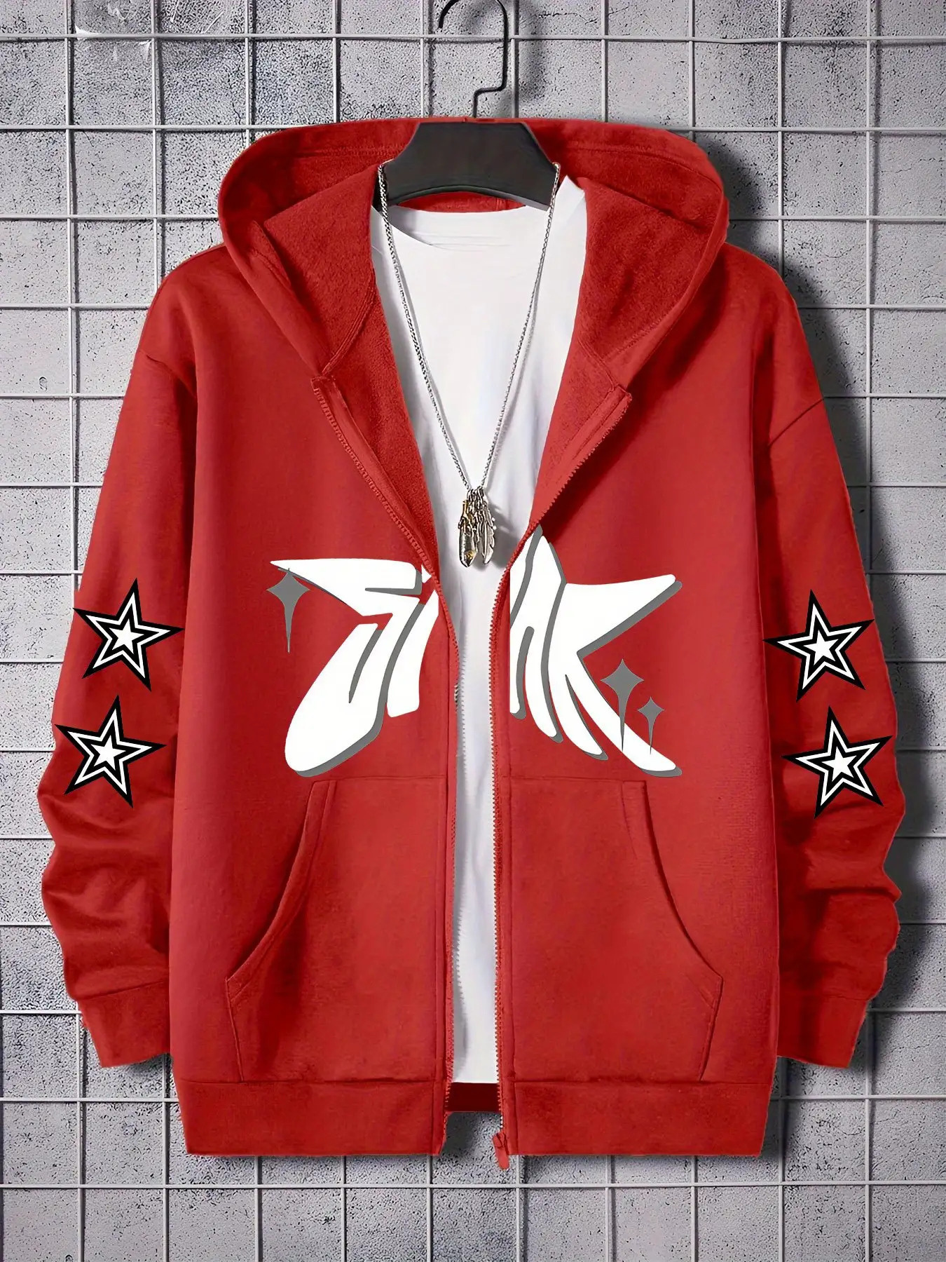 High-Quality Design Star Pattern Printed Zipper Hooded College Style Jacket Men's European And American Zipper Sweatshirt Casual Fashion, PLUS SIZE