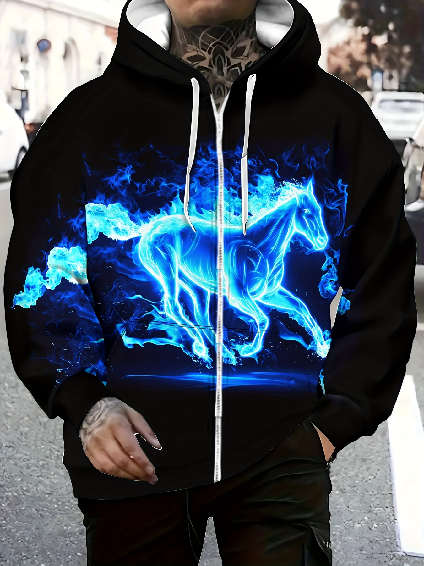 Men'S Long Sleeve Zipper Horse Pattern Hooded Sweatshirt | Autumn Winter Casual Outdoor Jacket with Drawstring and Pockets, Slight Stretch Fabric, Plus Size