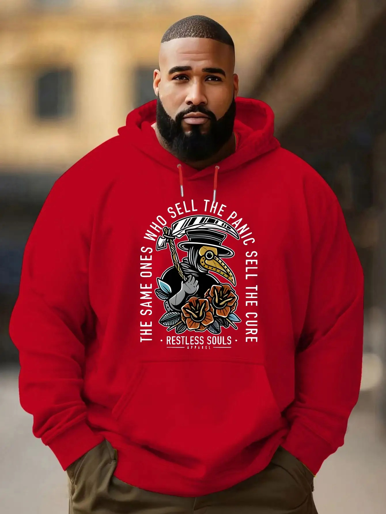 Plus Size Men'S Hoodie | Crane Blossom Clouds Text Trendy Patterned Hooded Sweatshirt, Hip-Hop Style, Unisex Autumn and Winter Fashion, Suitable for Daily Wear, 4 Color Options, Long Sleeve, Casual and Sports Style