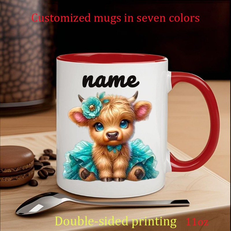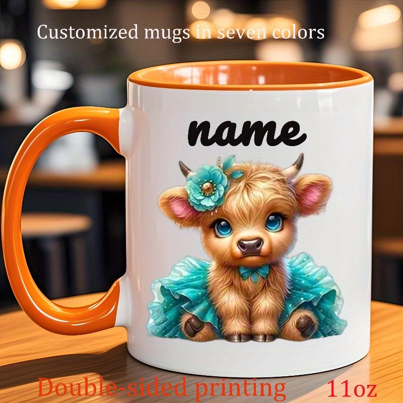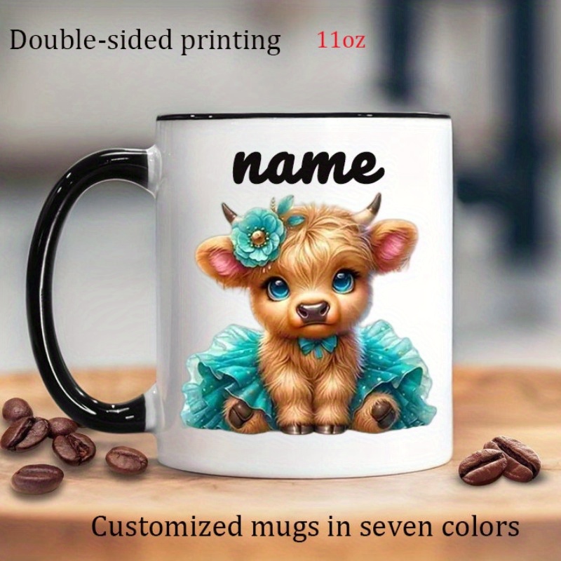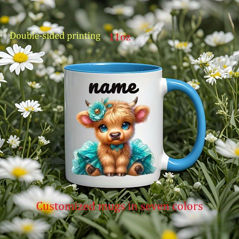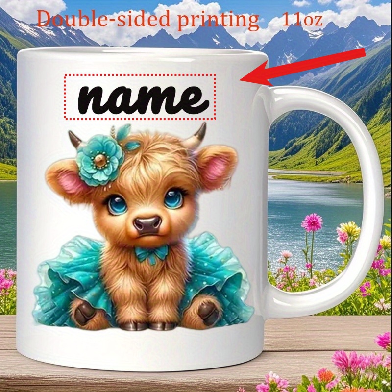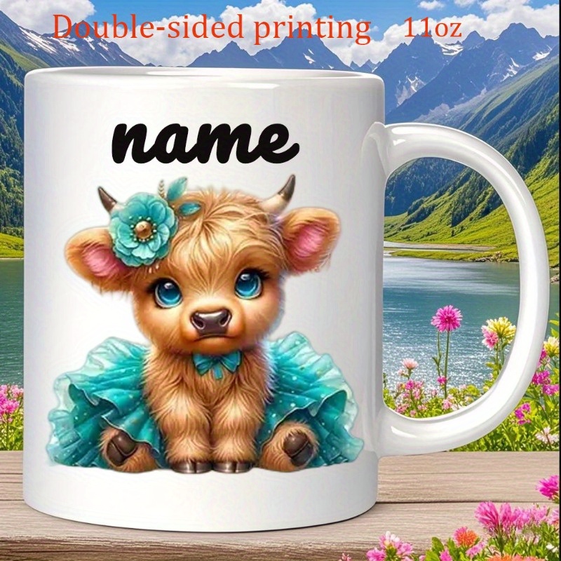Custom Ceramic Mug Featuring a 'Cute Little Cow Wearing a Dress And a Flower Crown', Personalized with a Name. This Coffee Cup Is Suitable for All Seasons—Spring, Summer, Autumn, And Winter. It Has Exquisite Double-Sided Printing