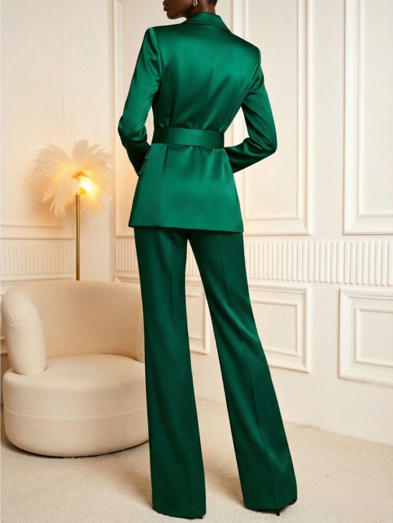 Dark Green Waist-Tie Blazer + Wide-Leg Pants Women'S Suit Set | Sophisticated Sleek Elegant Vibe Style for Fall Winter Office Commute & Business Gathering Formal Occasions