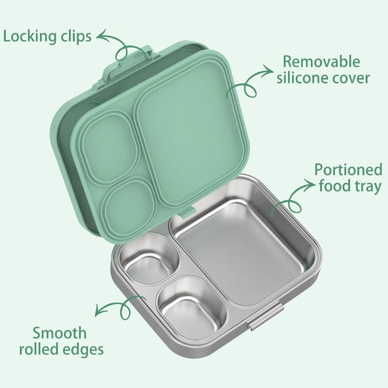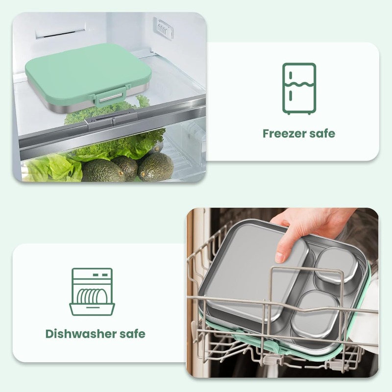 Stainless Steel Lunch Box: Metal Bento Box for Adults LeakProof 3 CompartmentsGreen, Non-Food Contact